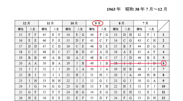 ④その表から「生まれた月」9月を探して、そこから「生まれた日」6日に下へただります。